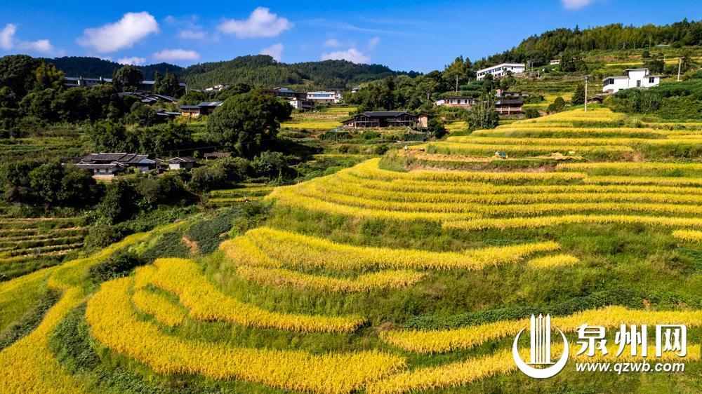 近日,德化縣龍門灘鎮(zhèn)霞碧村的梯田迎來水稻豐收季。金色梯田與青綠山林、古樸村莊相映成趣,宛如天然調(diào)色板。(陳小陽 許華森 許永源 攝)