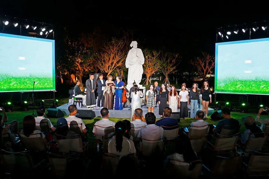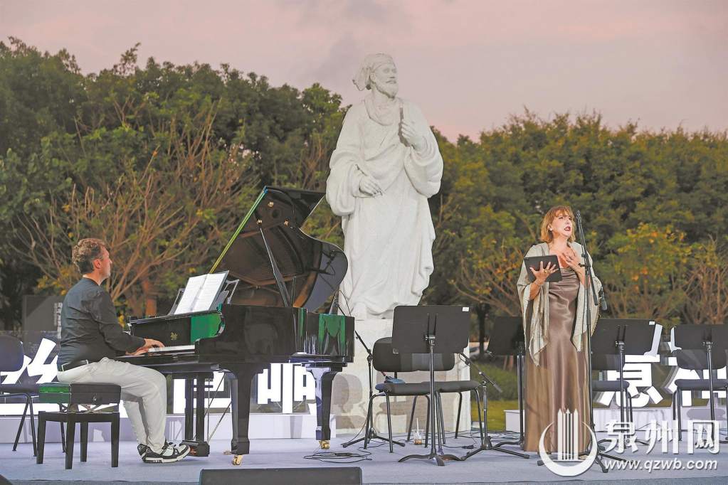 海風送爽,琴韻悠揚。10月11日下午,泉州市豐澤區(qū)法石片區(qū)的馬可?波羅雕塑廣場成了音樂的海洋,一場以“絲路回響·中意和鳴”為主題的音樂會如期上演。音樂會從圣桑的《天鵝》揭開序幕,鋼琴與大提琴勾勒出靜謐動人的旋律,隨后,意大利歌劇《小夜曲》的高亢嘹亮,瞬間點燃地中海的風情。轉眼間,《梅花操》的雅樂與《靜夜思》的吟唱,千年南音從絲弦間淌出,琵琶珠落,洞簫低吟,與西洋樂遙相呼應。最動人的和鳴在《茉莉花》《藍藍泉州灣》中綻放——鋼琴與大提琴遇見南琶與洞簫,東方婉約與西方浪漫交織共鳴。最后,泉州籍歌唱家王小春與瑟琳娜用中文合唱歌曲《送別》,引得全場掌聲雷動。