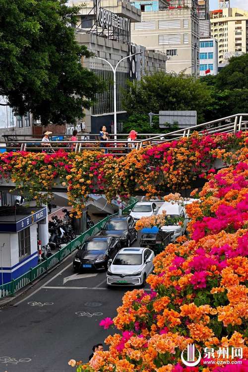連日來,泉州中心市區溫陵路與津淮街交叉口人行天橋的三角梅絢爛綻放,如同美麗的簪花圍。(融媒體記者陳曉東 攝)