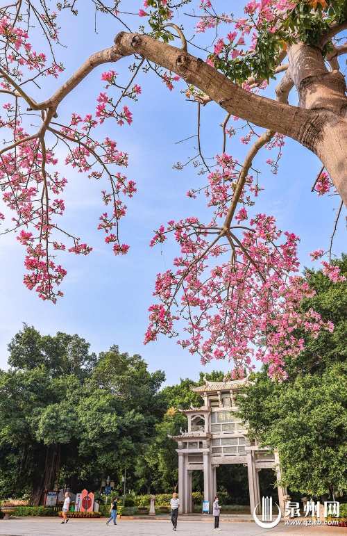 泉州中心市區芳草園廣場,異木棉盛放,粉色花瓣綴滿枝頭,如霞似霧鋪展秋日浪漫,成為一道美麗的風景線。 (融媒體記者 陳起拓 攝)