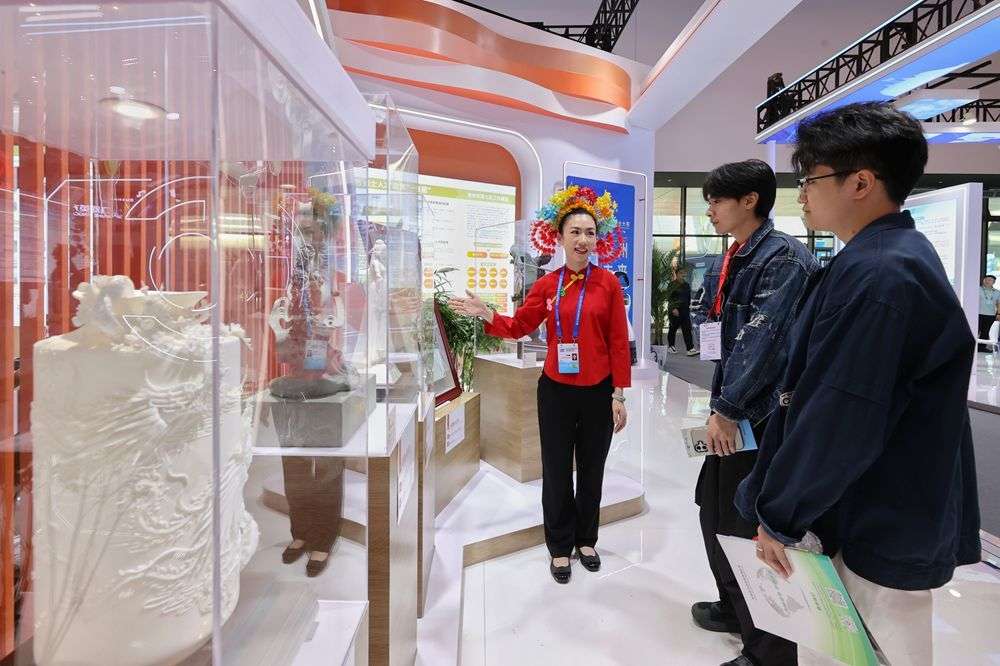 泉州館內(nèi),頭戴簪花圍的講解員,為嘉賓介紹泉州非物質(zhì)文化遺產(chǎn)展品。(融媒體記者陳起拓 攝)