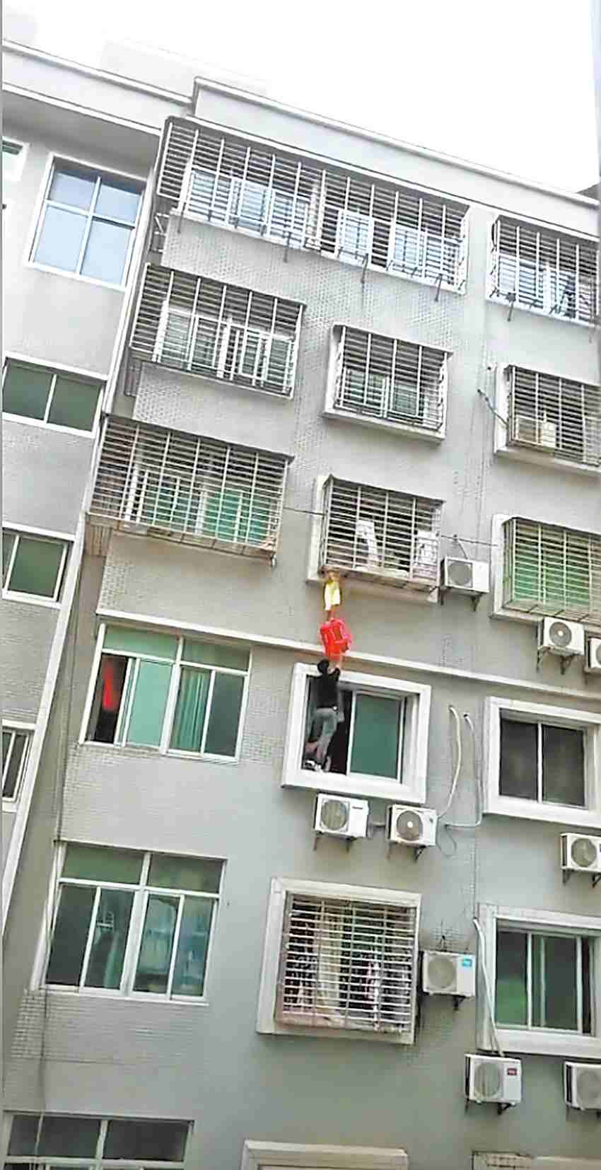 目擊者拍攝的視頻顯示,這起意外發(fā)生于一棟9層高的住宅樓,一名兒童頭部卡在7樓防盜窗縫隙,身體懸空搖搖欲墜。在6樓的窗臺(tái)上,一名穿黑色上衣的男子左手抓住窗臺(tái)上沿,右手舉著紅色塑料凳子,頂住孩子的雙腳往上托舉。此時(shí),7樓窗臺(tái)邊,一名大人雙手穿過防盜窗縫隙,將孩子摟住往上拖。“孩子掛在7樓,樓下那個(gè)小伙子看到了就沖上去。”目擊者說,萬幸孩子最終被救下,“小伙子帥呆了,見義勇為!”