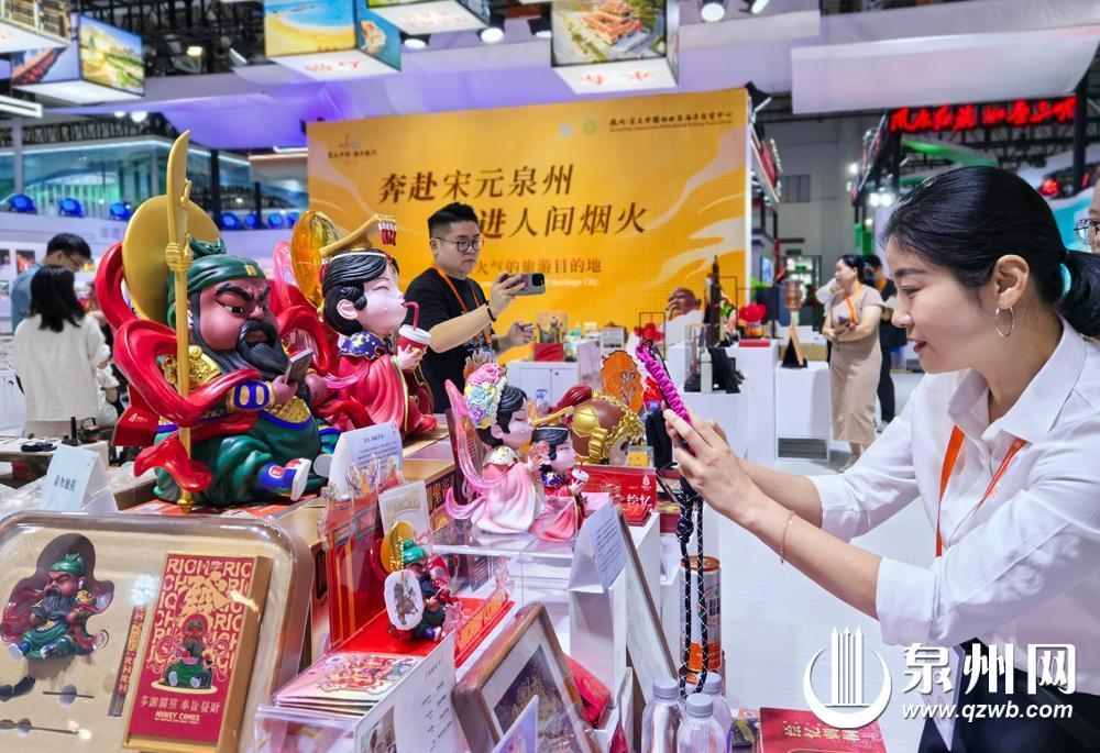 在泉州主題館,創意花燈、關帝圣君、海神娘娘、永生花小蟳女等文創擺件備受客商和游客喜愛。“關帝圣君與海神娘娘的形象結合了現代元素設計,以文化+潮玩+數字化的特色呈現產品,通過潮玩手辦形象,擴大體驗群體的年齡,用數字化手法,共赴一場中華祈福文化的奇妙體驗,讓傳統信仰在潮流語境中煥發新生。”泉州刺桐紀元文化傳播有限公司總經理、泉州市天宮造福科技服務有限公司聯合創始人傅旭儒說,該公司此次主要是展示城市IP和祈福IP的一些成果,關帝圣君與海神娘娘是其中的代表作品,不僅吸引客商和普通參觀者喜愛,還收獲了一些地方政府和文旅企業的合作意向。