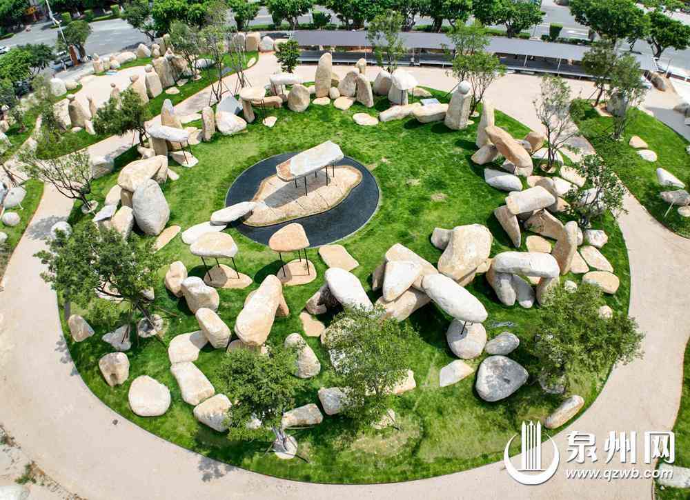 轉(zhuǎn)至車水馬龍的泉秀街與成洲路交叉口,另一處風(fēng)格迥然的磐云石頭藝術(shù)公園將約200塊來自泉州深山的原生巨石“搬”進(jìn)了都市中心。這些石頭數(shù)量多、塊頭大,每塊都保持著最原始的形態(tài),或如春筍破土,或似拱門凌空,還有的結(jié)合鋼管堆疊成各種形狀,成就一幅極具沖擊力的大地藝術(shù)畫卷。它既是新晉的拍照打卡地,也為散步途中的城市視野注入鮮明的視覺沖擊。
