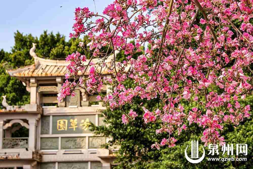 若想感受更豐富的秋冬色彩,不妨前往小山叢竹與芳草園。這是近距離、沉浸式擁抱秋冬繁花的好地方。小山叢竹公園是泉州舊八景之一的園林,既藏著朱熹講學(xué)的文脈,也留著弘一法師圓寂的晚晴室。誠正堂邊,幾棵欒樹枝繁葉茂,黃的花、紅的果層層疊疊,風(fēng)一吹便簌簌落在地上,星星點(diǎn)點(diǎn)很是浪漫。逛累了,可到書院圖書室小坐片刻,或于過化亭歇腳。秋冬之際的芳草園是另一番明媚。兩排異木棉正熱烈盛放,粉色花朵層疊如霞,在陽光下格外絢爛。漫步其間,仿佛踏入粉色童話世界,花香縈繞,每一步都踩著秋冬的浪漫,讓松弛感在行走中慢慢沉淀。