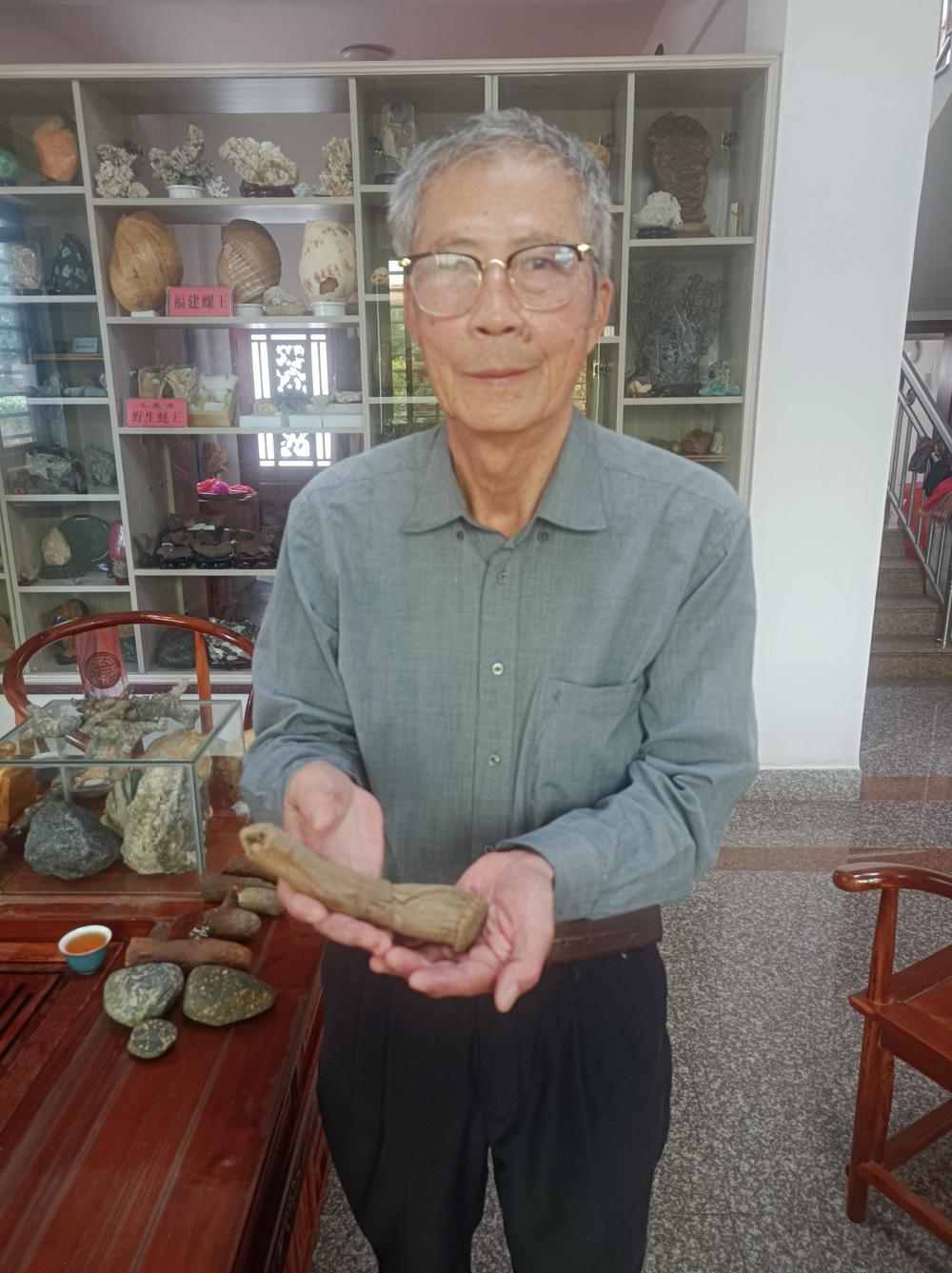 今年74歲的顏心玉退休前是惠安縣凈峰鎮政府干部。出于愛好,20世紀90年代起,他開始收集石頭和化石等物品。近年來,只要不刮風下雨,他都會在傍晚時分前往離家不遠的惠女灣沙灘及海堤一帶散步,順便“尋寶”。
